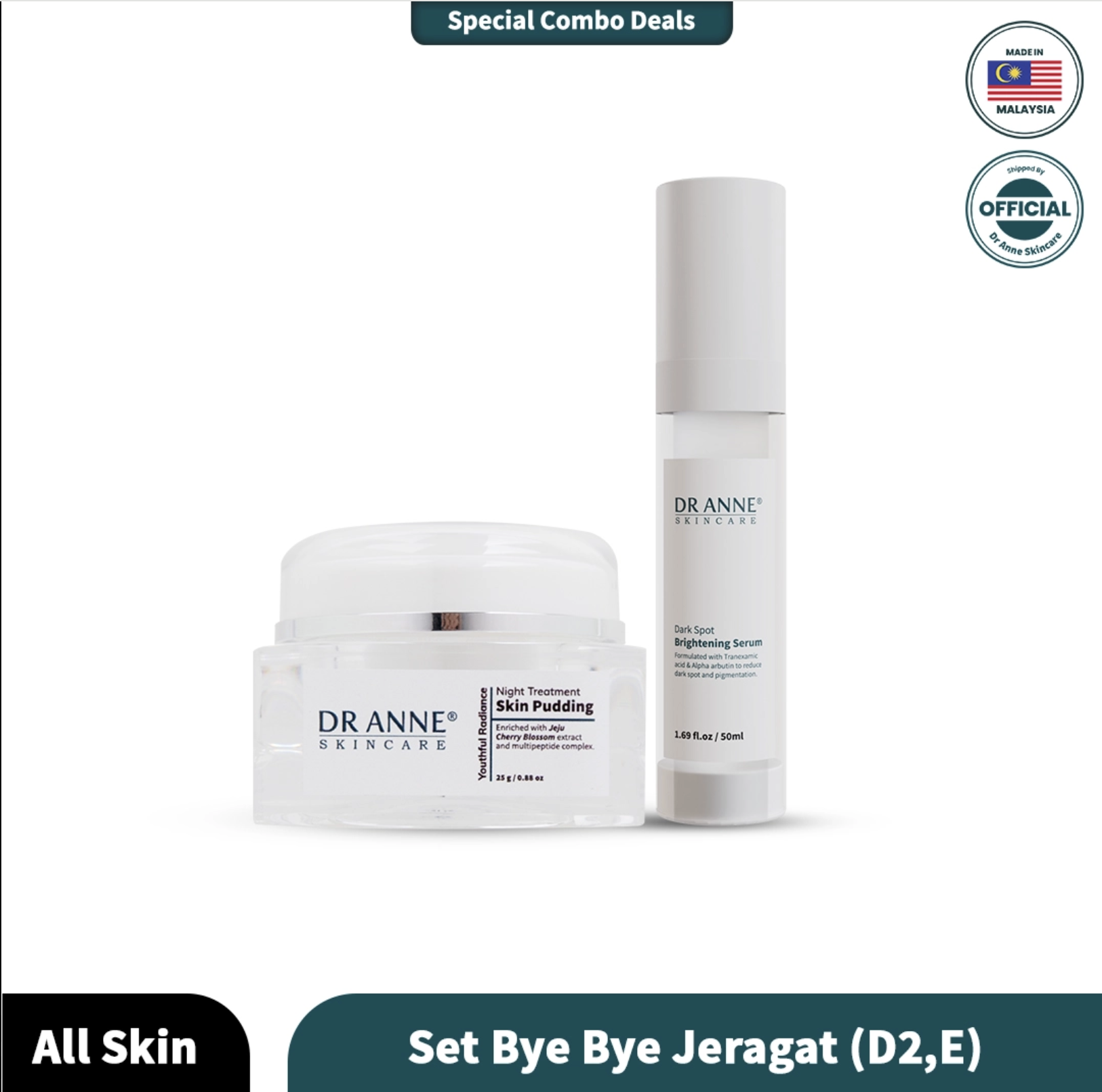 The “Set Bye Bye Jeragat Melasma All Skin Types” collection is a complete set of 2 meticulously designed skincare products from Youthful Radiance and Bright and Glow Dr. Anne Skincare, catering to both day and night routines.